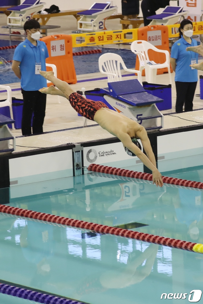 제10회 김천 전국수영대회 남자 고등부 경기에서 신기록 행진을 계속하며 대회 5관왕을 차지한 고교 수영 괴물 황선우 선수 자유형.